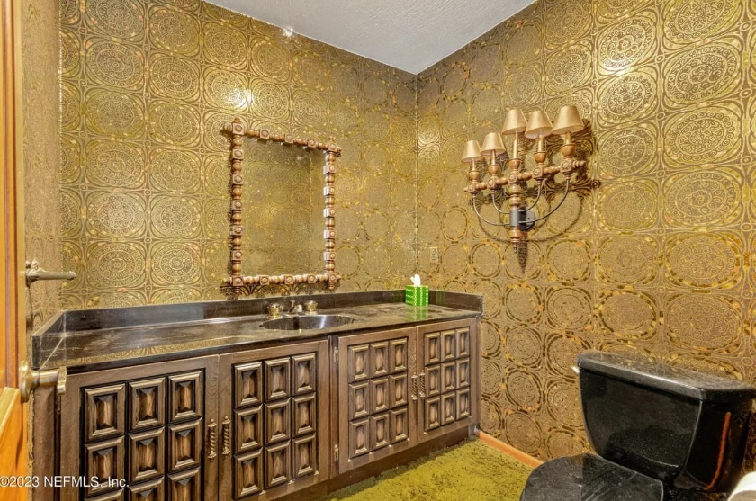 I did mention that the carpeting was wall-to-wall, right? I just wanted to remind you of that because the wallpaper is so — what is the word I am looking for? — reflective, that you could go forever without noticing the shag carpeting in the bathrooms.