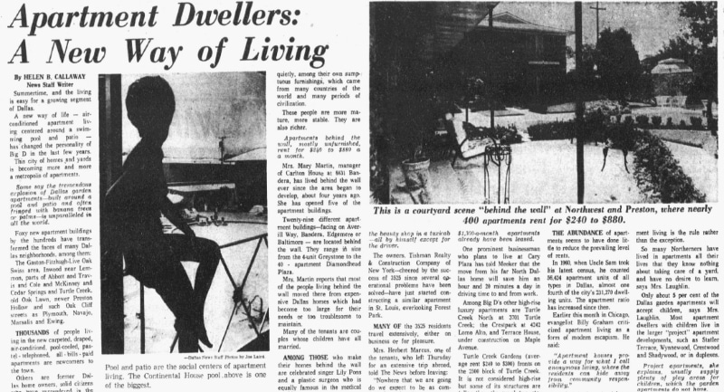 “This city of homes and yards is becoming more and more a metropolis of apartments,” the Dallas Morning News wrote. “Some say the tremendous explosion of Dallas garden apartments — built around a pool and patio, often fringed with banana trees or palms — is unparalleled in all the world.”