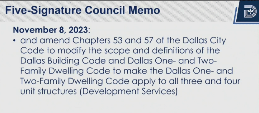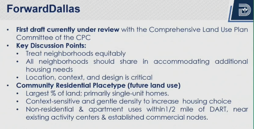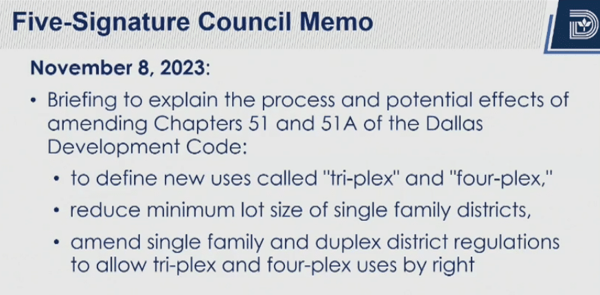 Interim Planning and Urban Design Director Andrea Gilles emphasized the briefing was “just a conversation” called for in a memorandum authored by District 1 Councilman Chad West and signed by four other Dallas City Council members.