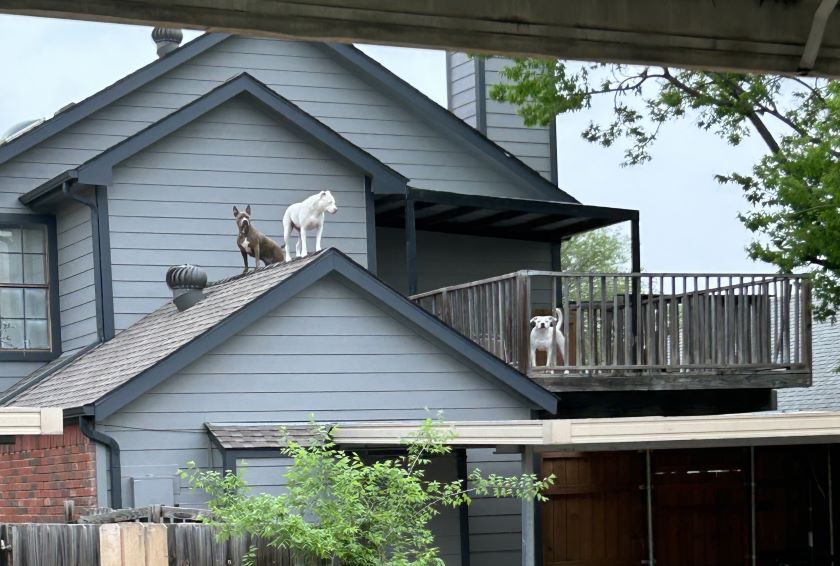 These are the neighbor’s dogs, and the inspector said, “You guys, I feel like I’m about to get jumped.” My money was on the white one staring him down from the balcony. If I’m the Realtor, I’d be talking about what a safe neighborhood this is. No one is breaking into anybody’s house with this gang keeping watch!
