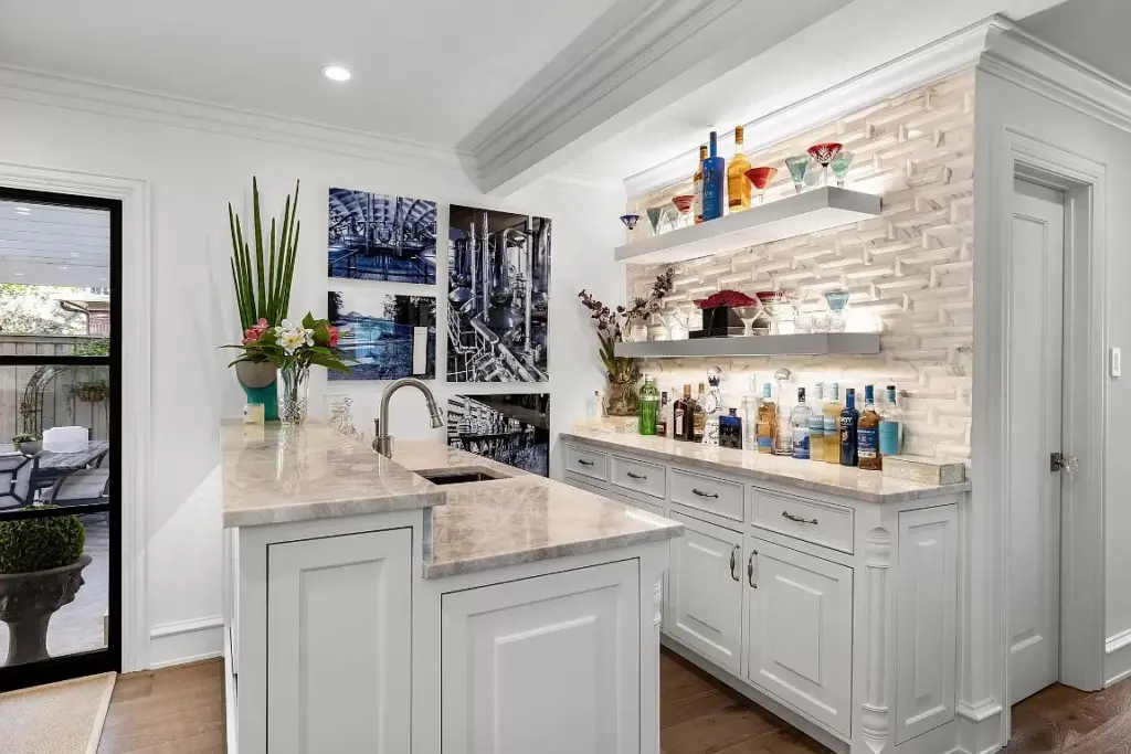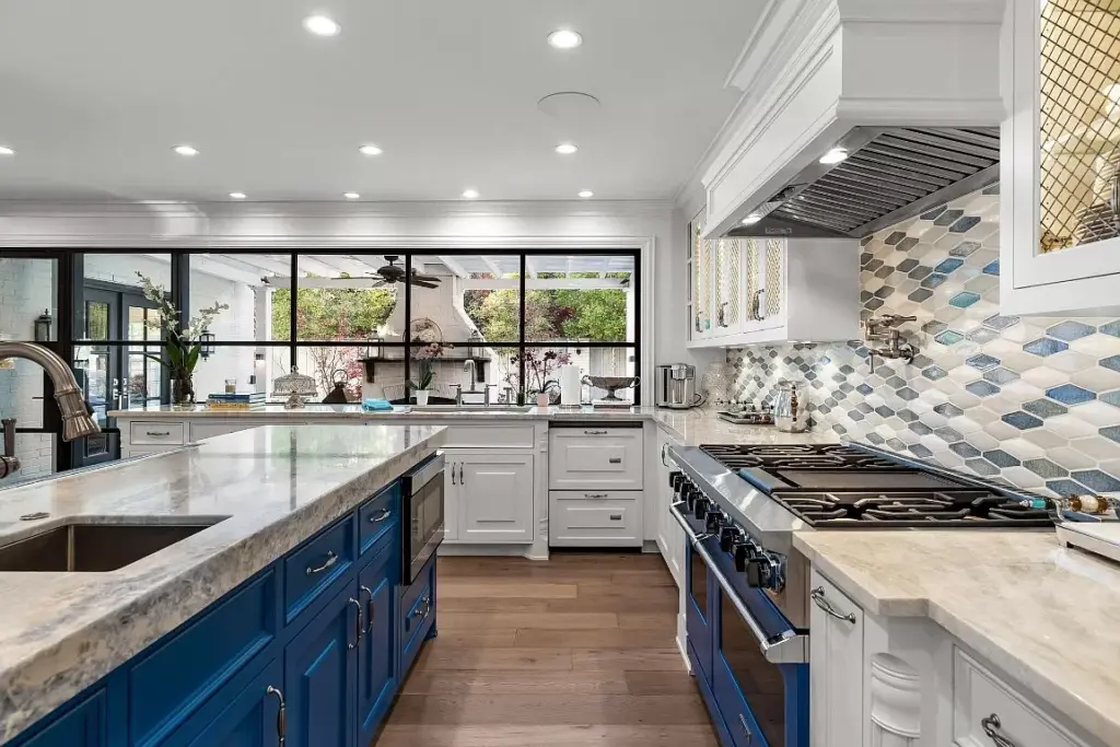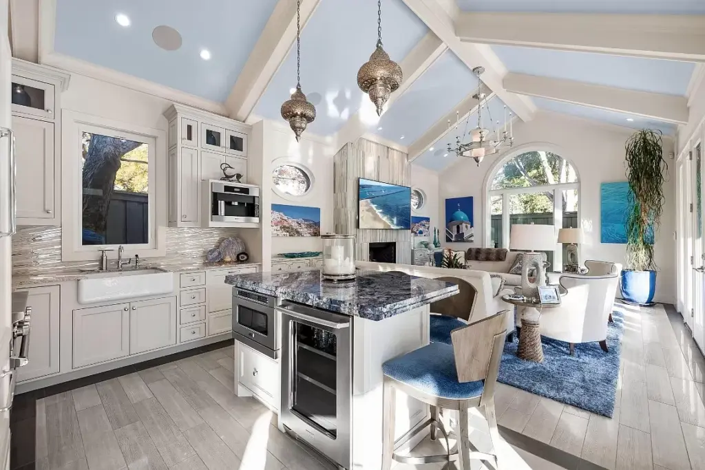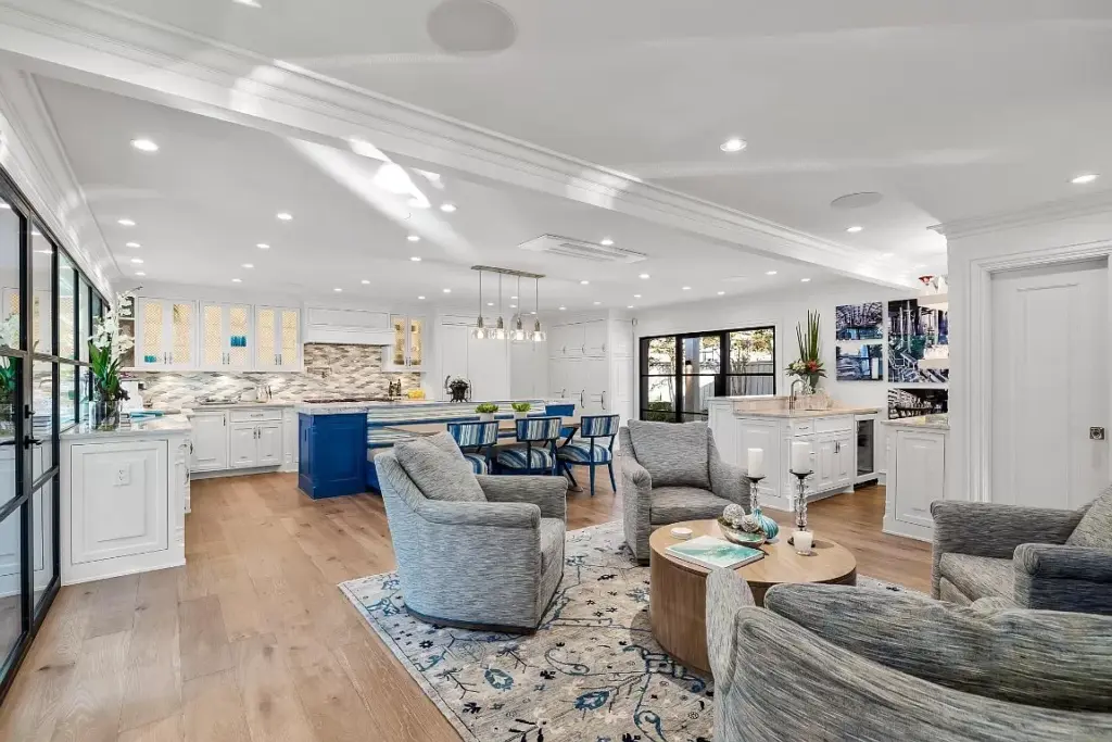 Then, everything opens up to an incredible kitchen complete with an enormous eat-in island, beautiful backyard views, and commercial-grade appliances. Also, a connected bar creates even more opportunities for those unforgettable entertaining experinces.