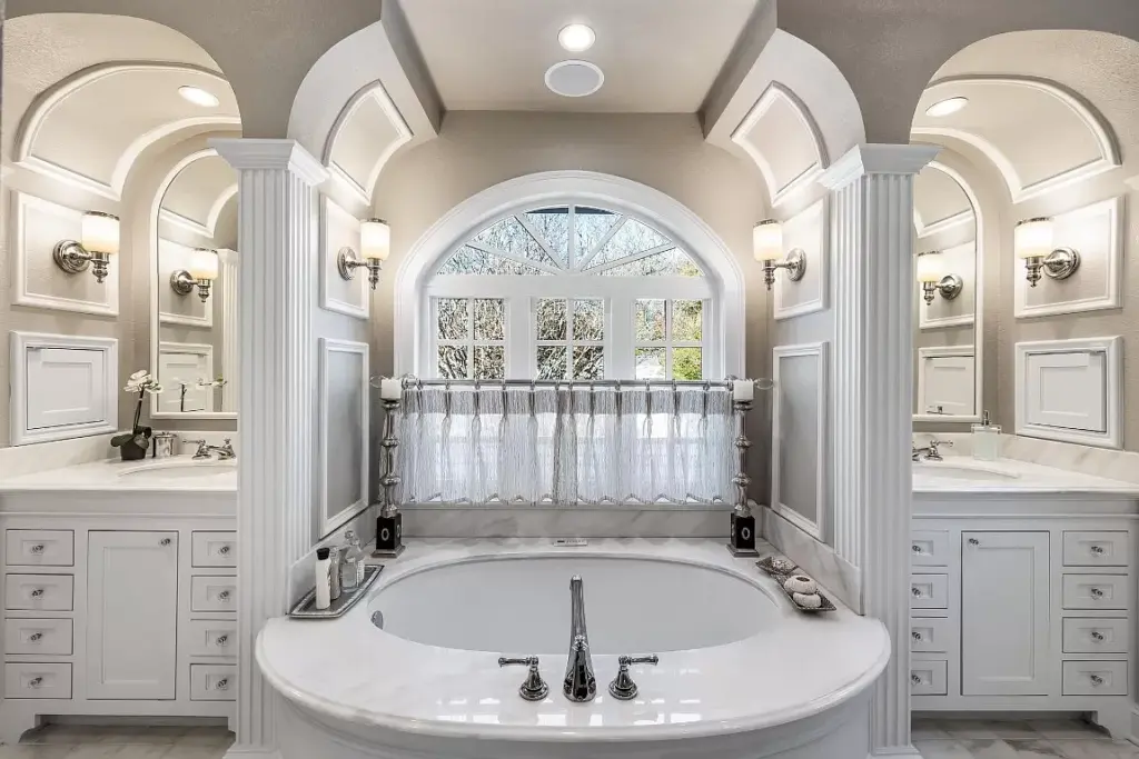The ensuite bathroom blends unique style and luxurious sophistication. Here, a centerpiece soaking tub anchors elegant dual vanities and looks out on an impeccable view of the backyard.
