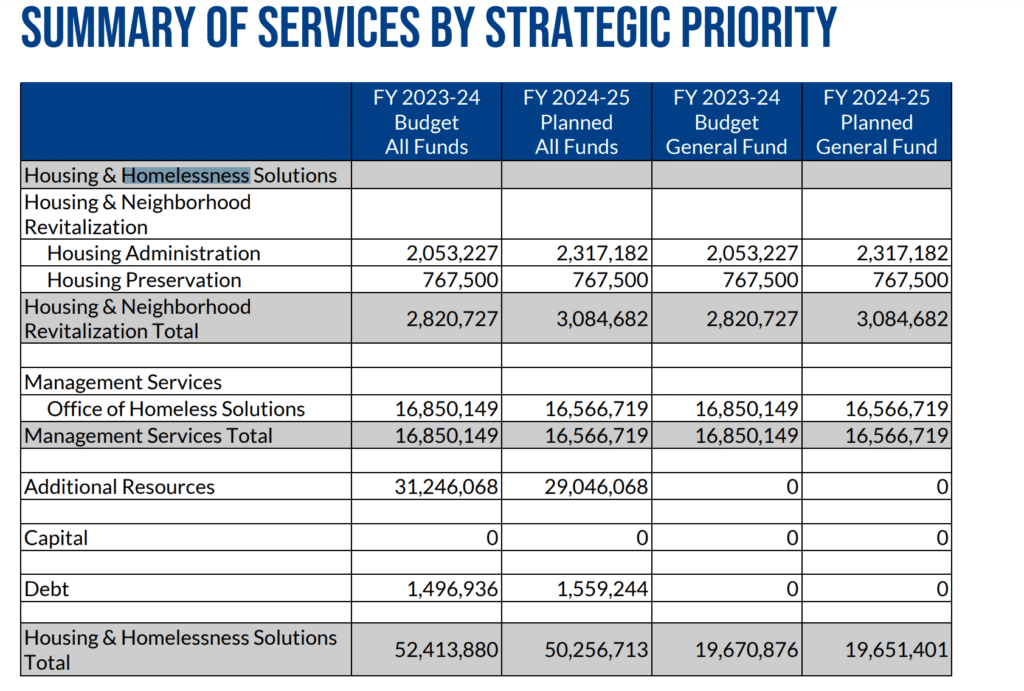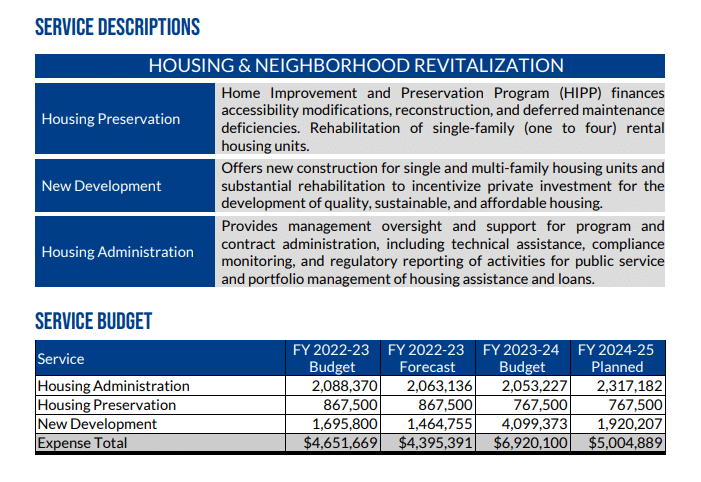 The recommended budget shows about $20.5 million coming in from “additional resources” for housing, including the Community Development Block Grant and HOME Investment Partnership funds.