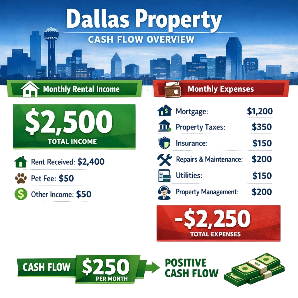 - Positive cash flow means rent and fees cover your costs, with money left over.