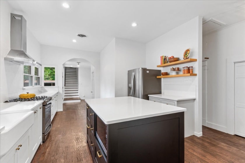 I freaking love the kitchen, too. You get a long countertop like you’d find in a galley kitchen, but then they added an island plus even more countertop on the other side. There’s also plenty of closed storage and two perfectly placed floating shelves to add your own personality and pops of color.