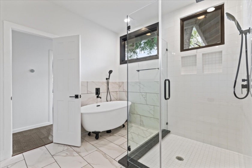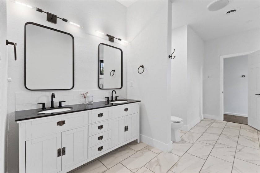 It’s vintage and charming on the exterior and throughout so many details inside. But it’s also updated to today’s desires – both functionally and aesthetically. The bathrooms are the perfect example. Stolarski said the bathrooms were updated for that very purpose – to bring the vibe of this home into the modern day. (It was tiled counters and slate floors, now it’s crisp marble tile, accent mirrors, and slide-in vanities.)