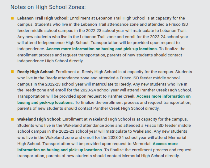 Frisco ISD is one of the fastest-growing districts in the nation, and one middle school and three high schools are at capacity, Frisco ISD reported in December. That means some potential students are getting turned away for the 2023-24 school year, forced to enroll in a different school than the one their parents bargained for when they purchased the home.