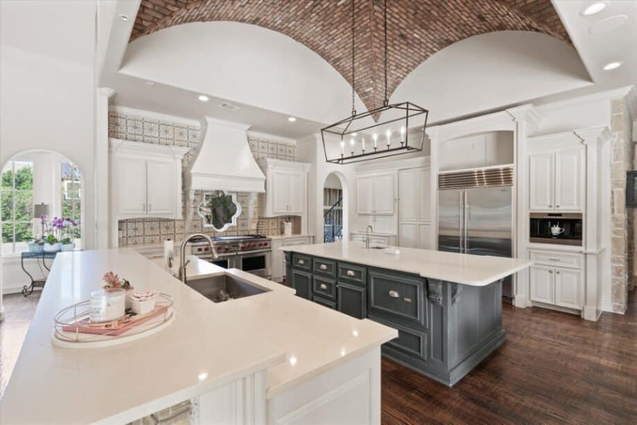The family focus is evident in the floor plan with a living room connected to a kitchen where family meals can be whipped up. That same kitchen connects to entertaining since it contains two large islands, two fridges, two ovens, and two microwaves.