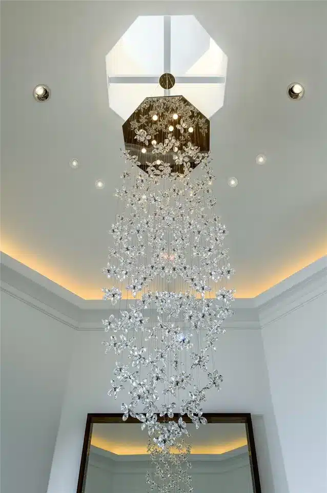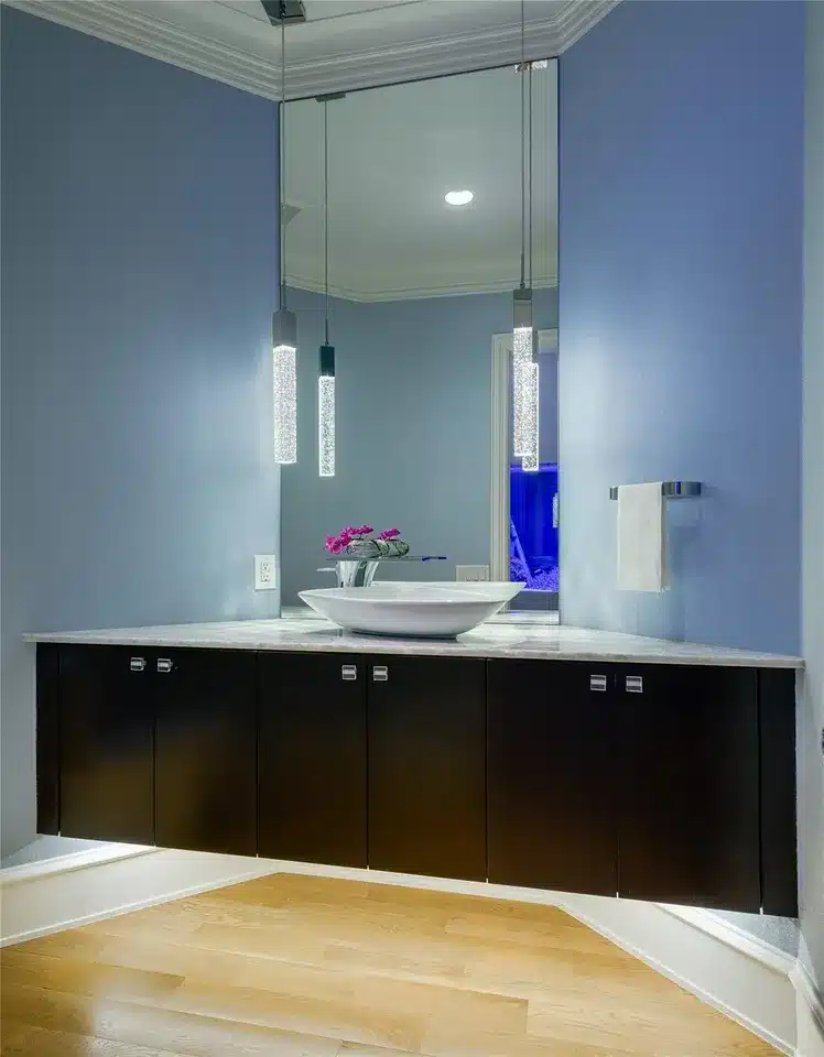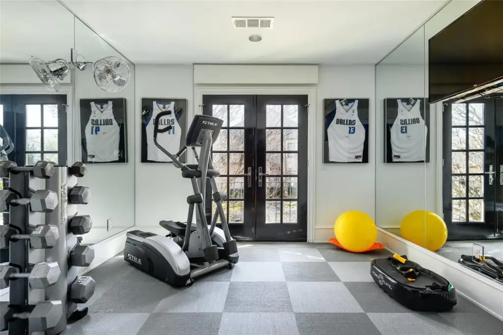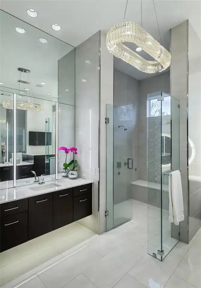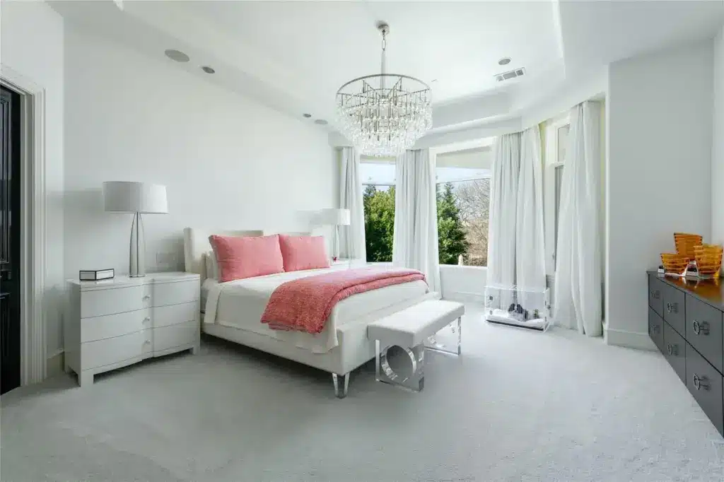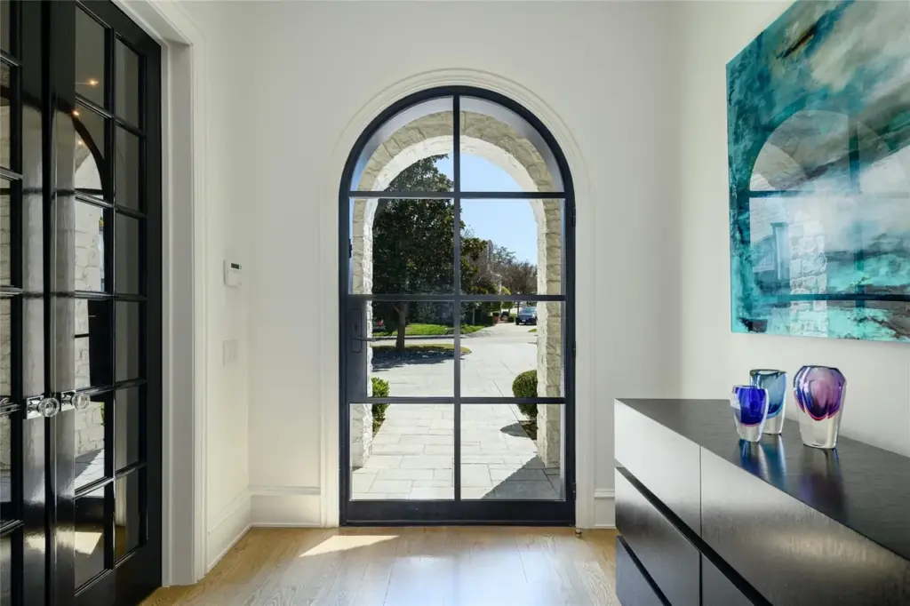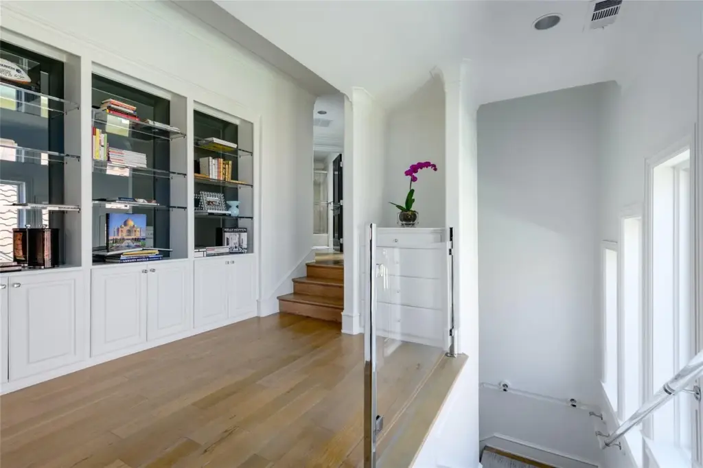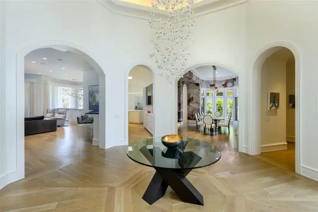 The first thing to catch your eye: A Swarovski crystal chandelier that was custom-made for the 19-foot-high grand foyer. Five “spokes” stem off of this space, leading to different rooms of the home. You’ll sense a theme throughout with the shimmer of crystals, acrylic, and Lucite. Sparkle and gleam are very much part of this home’s personality, but in a way that doesn’t detract from the uniqueness of each hand-selected element. Word to the wise: expect that when you have company, every visit will start with a lengthy Q&A session about X, Y, or Z, so it’s probably best if the next owner is a patient person.