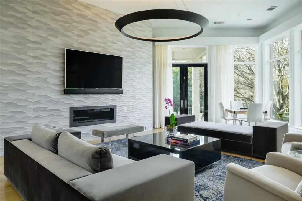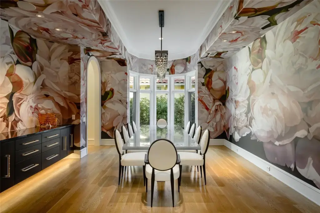In the dining room, the Allan Knight chandelier, White Peonies wallpaper, and built-in marble-top hutch with under-mount lighting can all help to revive any lagging dinner conversations. You can then adjourn to the family room, and start a new discussion around the custom tile wall, another spectacular Allan Knight chandelier, or the view of the patio and pool.