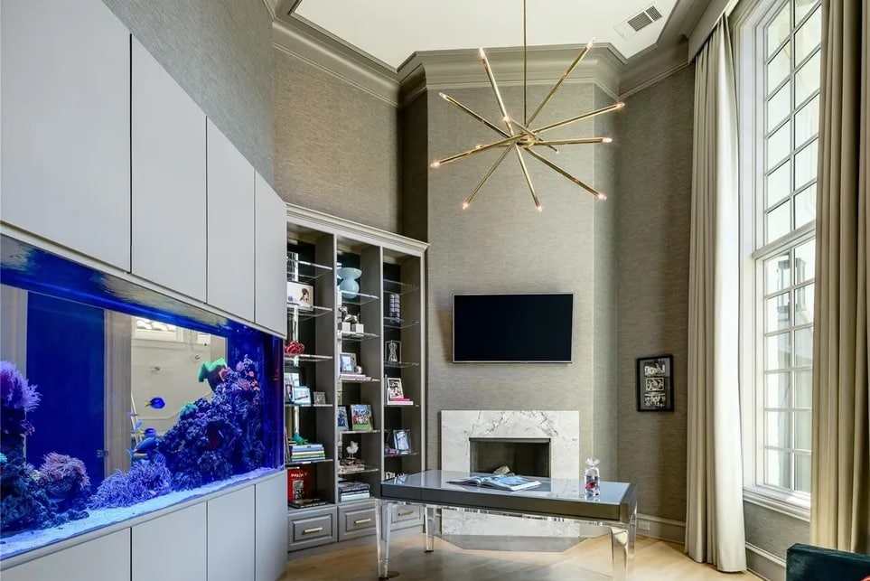The study features a double-sided 900-gallon fish tank (how’s that for a Zoom background!), and by the time you take possession, you will have completely refinished 5-inch, wide-plank white oak flooring.