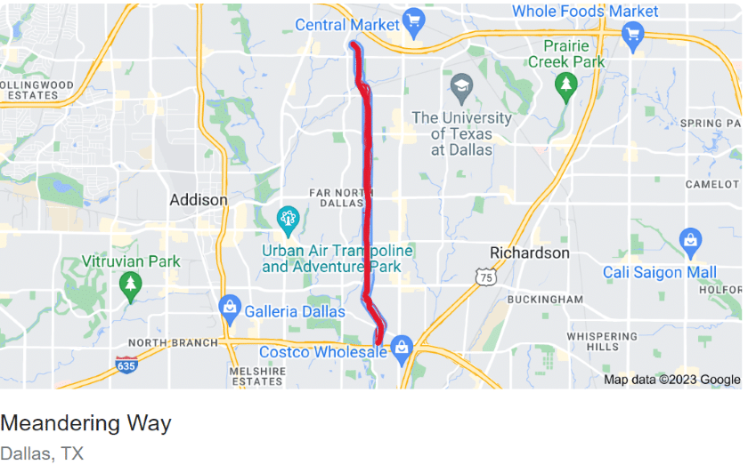 Then Pegman (that’s his name) continues to Westwood Jr. High on Arapaho Road, Bowie Elementary near Campbell Road, and Preston Ridge Trail at McCallum Blvd. I feel like I’m losing you, but we’re almost there I promise.