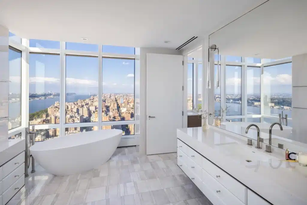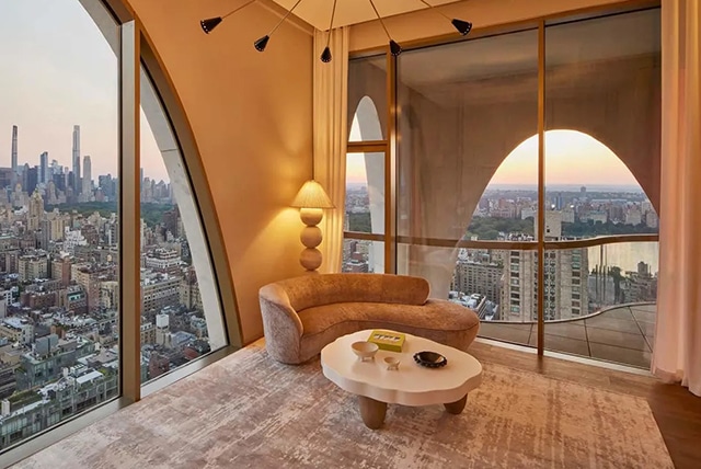 The open floor plan — the handiwork of DDG Partners and HTO Architect — sports two spacious living areas complete with soaring ceilings and dramatic archways. Floor-to-ceiling windows provide panoramic views of Central Park, the city skyline, and the Hudson and East Rivers.
