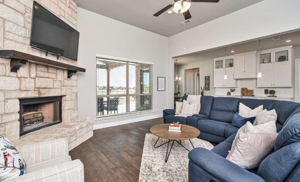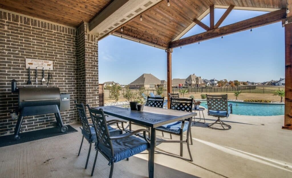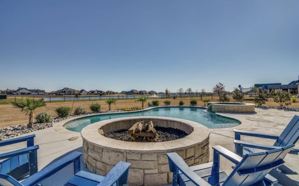 Built in 2019, the home features a heated pool and spa, and backs up to the main neighborhood lake. A built-in firepit, perfect landscaping, and an extended covered patio ensure the new owners will take a staycation and won’t want to leave for spring break or any other reason.