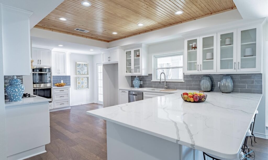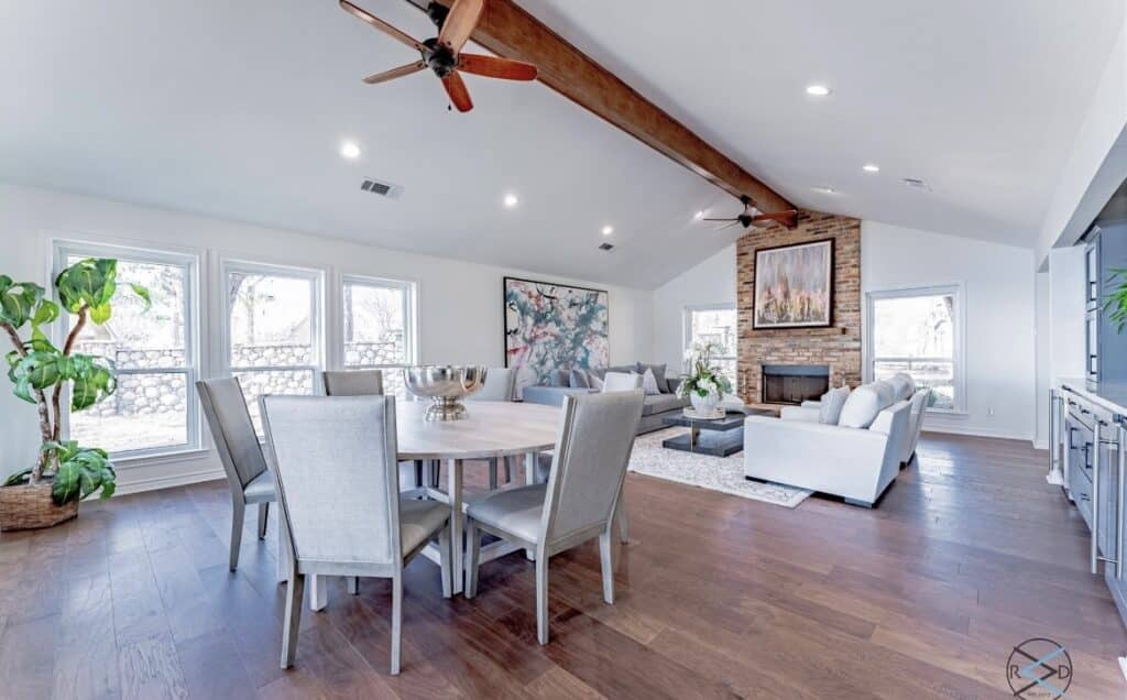 The home on Diamond Drive was recently remodeled and expanded, with a massive kitchen for entertaining, a wall of windows, a fireplace, a wet bar, custom cabinetry, quartz counters, and engineered wood flooring.