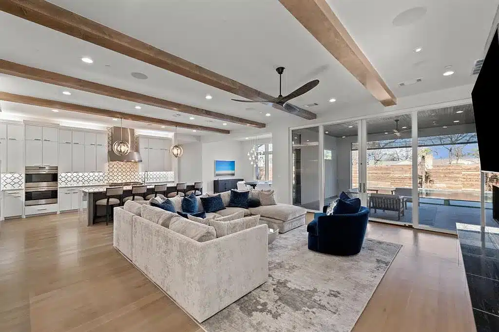 This house gives lots of reasons that the team, the fans, and the coaches will want to hang out here. Not unusual for a Mavs player. Tall-as-a-center windows line the front and the back of the house. White walls, not Mavs’ blue or green, surround the home accented with wood beams.