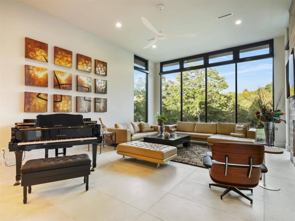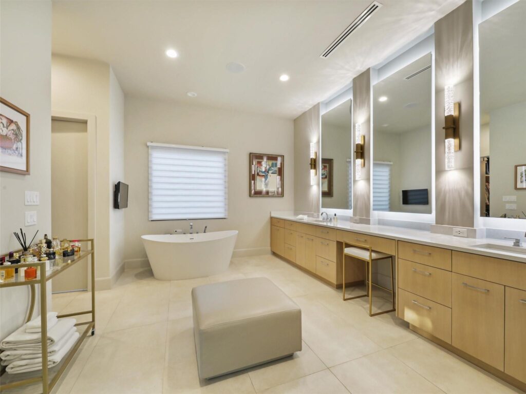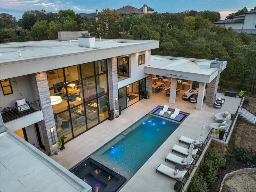 Other notable features in this 7,012-square-foot, app-controlled smart home include a see-through, 8-foot linear fireplace, floating staircase, a chef’s kitchen with separate prep kitchen, and a dreamy 20-by-21-foot primary suite with spa-like bath and its own large private patio … perfect for contemplating – coffee or wine in hand – your good fortune to live here.