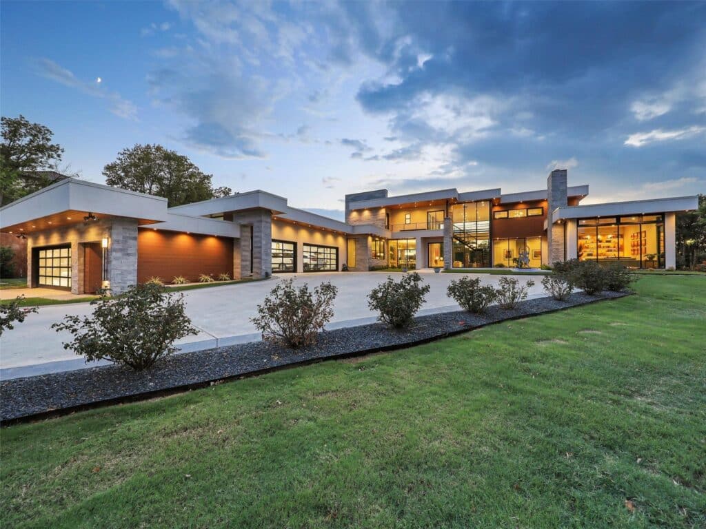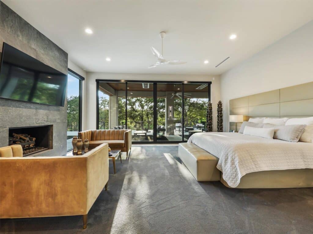 “This gated, modern 2.3-acre estate is strategically set on a private cove along the shores of Lake Grapevine,” Kelly Marcontell says. “It was custom built in 2021, and was thoughtfully designed with no detail overlooked, so it’s loaded with the latest in high-end finishes and features. Many of those incorporate natural elements to complement the gorgeous lake views you can savor from every balcony or deck and almost every window.”