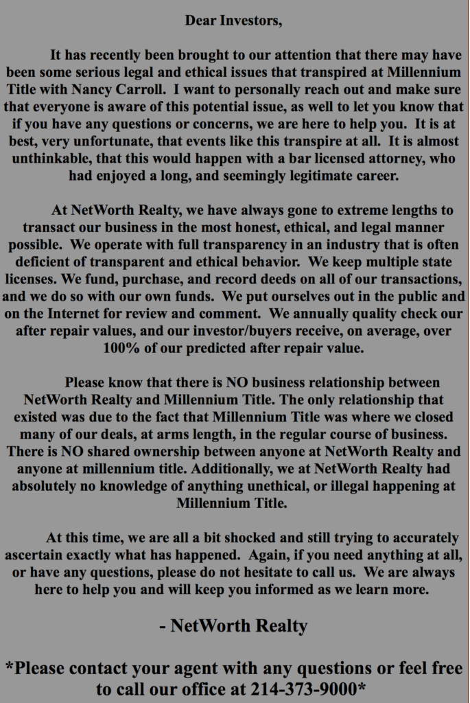 According to court records, Carroll committed multiple acts of money laundering throughout North Texas, and used stolen money to pay off notes on her own personal real estate purchases. She also created a Ponzi-like scheme of placing other’s real estate assets into trusts to hide her ownership of them. One victim told me he was mowing the lawn at his McKinney home when he was served with foreclosure documents on his prior home — a home he had sold, or believed he had sold, through Nancy Carroll. Instead, she put the property in a trust, never wired the payoff, but made the monthly payments. Once she stopped making the payments, the bank began foreclosure proceedings. At least one North Texas real estate firm was sending letters to customers like this: