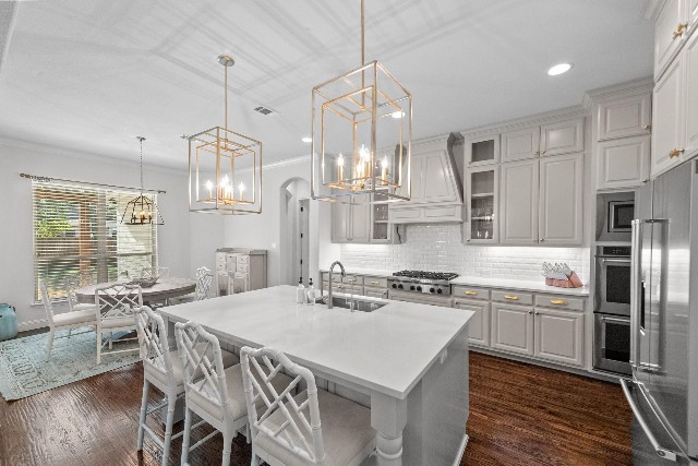 Of course, there is a formal dining room, an open kitchen-living-breakfast area, and a large kitchen island for everyone to congregate. The kitchen has double stainless ovens, a six-burner gas cooktop, a huge walk-in pantry, and cabinets to the ceiling (always a favorite of Tarrant County Tuesday … no room for roosters!).