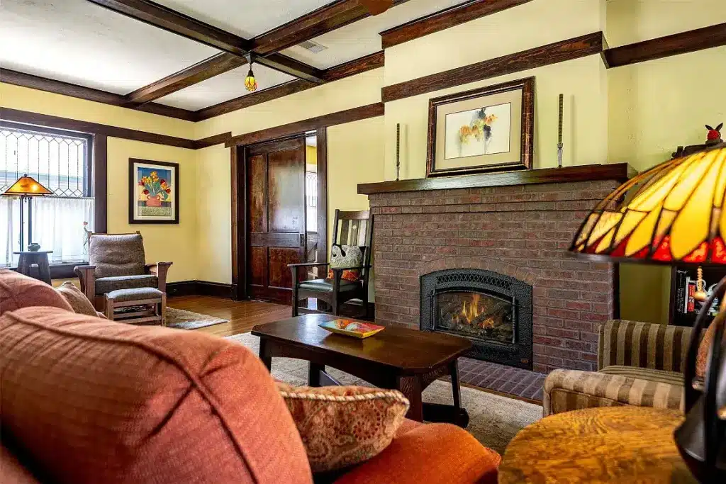 This cute house, located in the Fairmount Historic District, is within walking distance of trendy coffee shops and restaurants where you could happily sip coffee wearing a sweater — that is once the true fall weather arrives. Built in 1916, the Prairie-Mission-style house has been restored, yet retains its historic charm.
