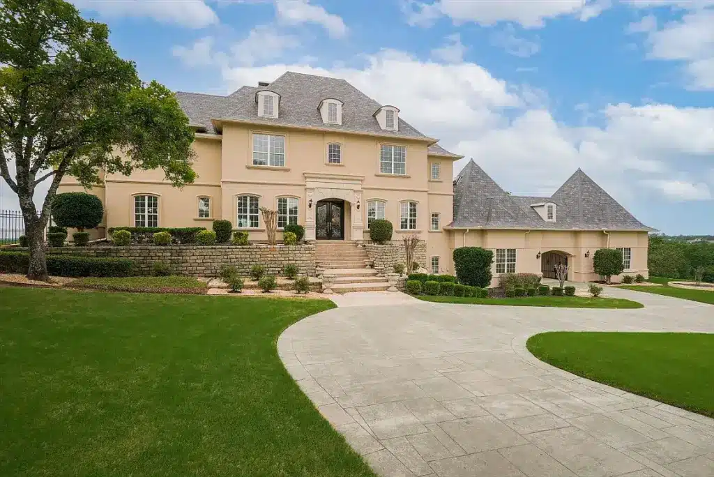 Enjoying the fall sunsets as the weather cools off would be a bonus that comes with this estate sitting on almost two acres on a cul-de-sac in The Estates of Tour 18. The Denton County gated community also features a golf course, playgrounds, trails, and a restaurant.