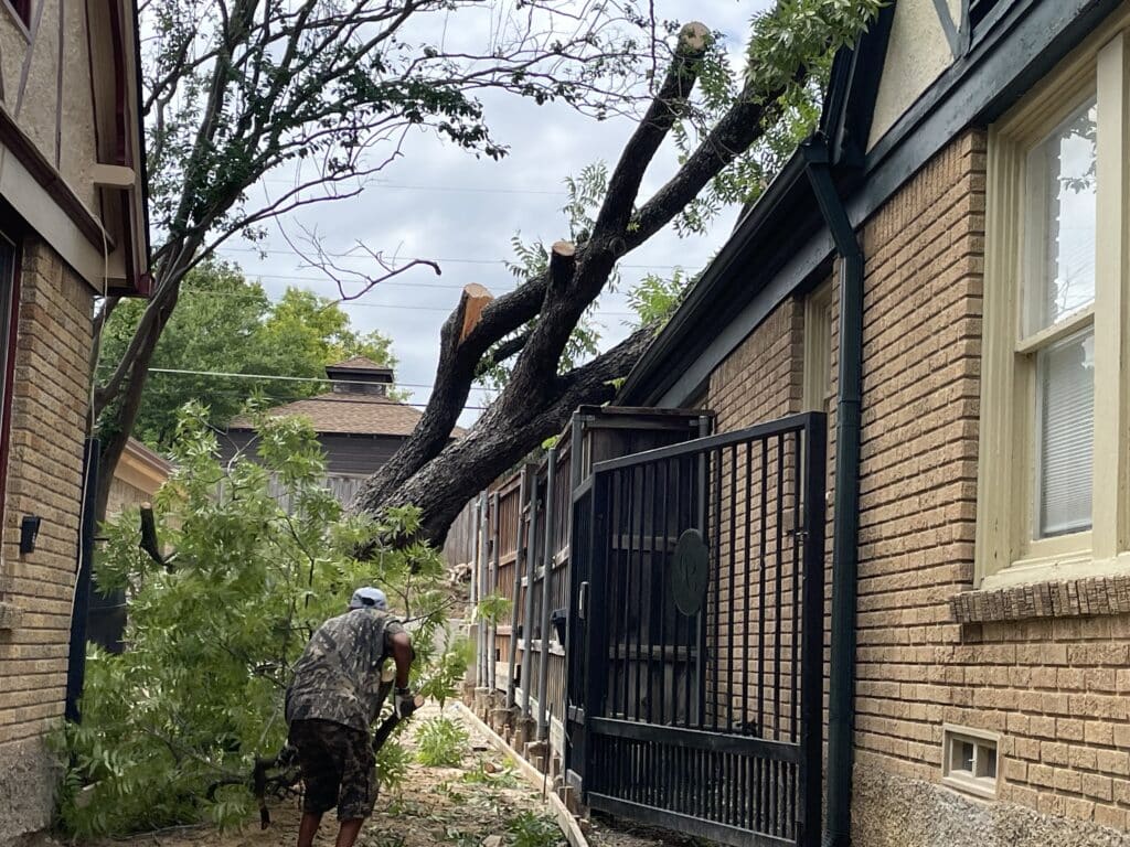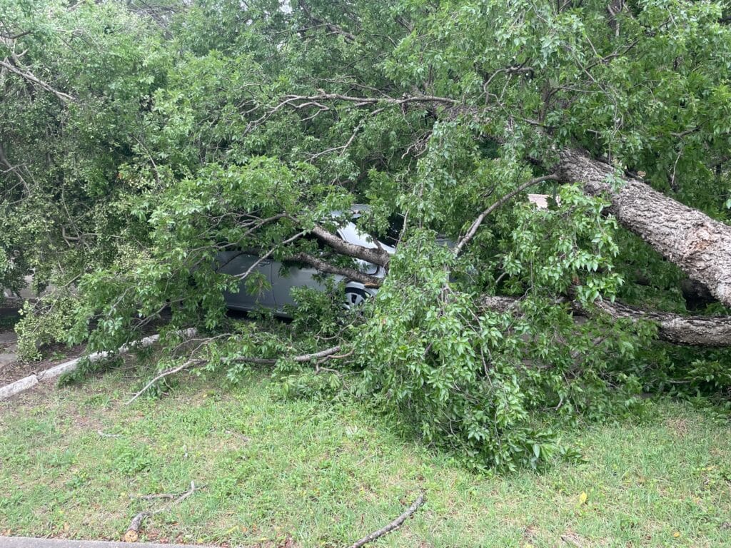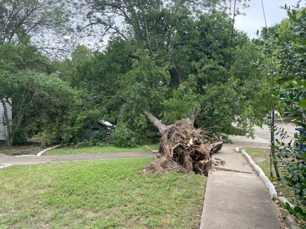 daltxrealestate.com received photos of several downed trees in East Dallas neighborhoods. Massive oak trees throughout the Lower Greenville and Hollywood Heights neighborhoods crushed vehicles and blocked streets. As of this morning, almost 6,000 North Texas customers are still without power according to Oncor’s storm response map.