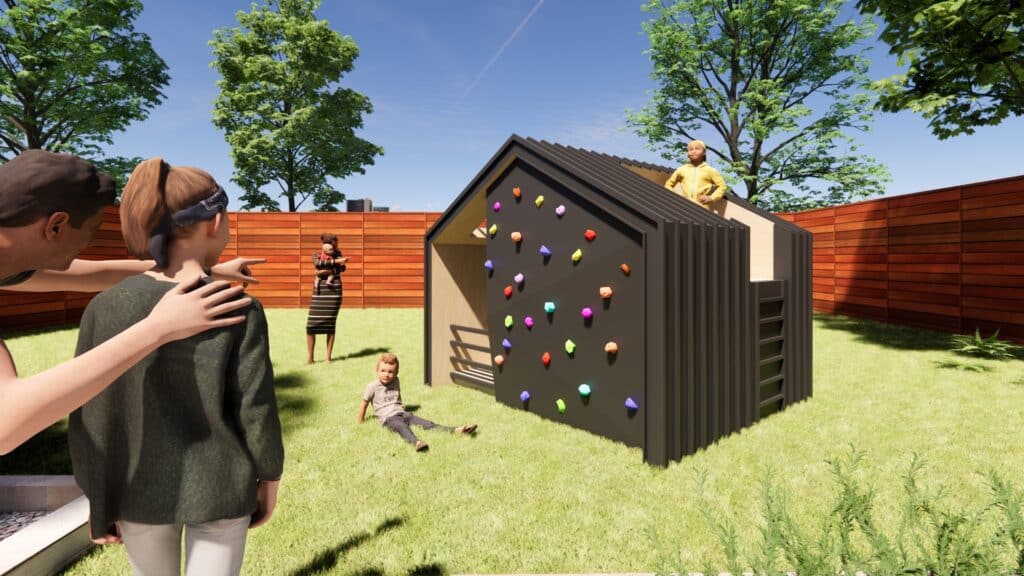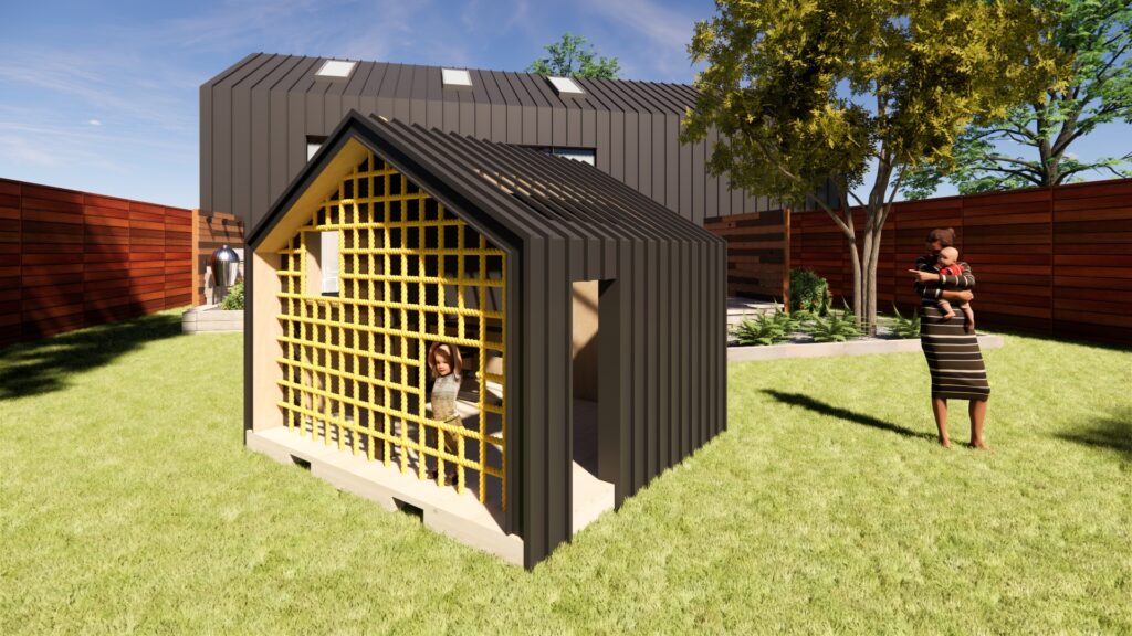 The design of the playhouse seeks to become a kid-sized version of one of The Quad buildings: A sleek continuous black exterior mimicking standing seam metal, a faceted climbing wall, a suspended cargo net, and an elevated ‘crows nest’ giving kids a unique vantage point. The design also integrates skylights, monkey bars, and interior hiding spaces to encourage physical exploration of the playhouse for endless summer fun!