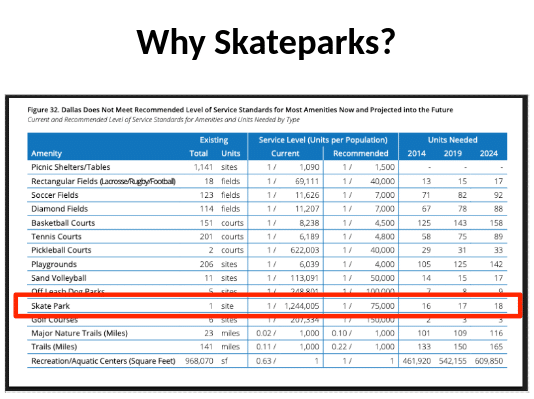 “The major concerns are coming from the immediate neighbors,” he said. “The legitimate concerns are noise and traffic. Skate parks are actually quieter than pickleball. As for traffic, teenagers might get dropped off or they might skate in or ride in from a nearby neighborhood, or they might come in from North Dallas or South Dallas on the [Dallas Area Rapid Transit] rail.”