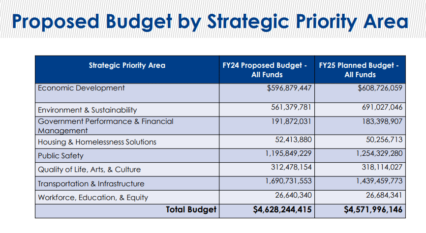 City Manager T.C. Broadnax is recommending a $4.63 million budget. By comparison, last year’s adopted budget was $4.51 billion. The city manager is recommending an 8.1 percent general fund increase over last year’s adopted budget.