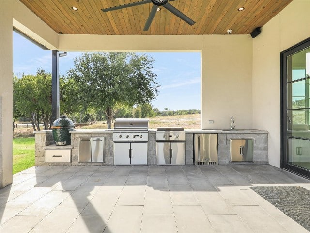 Here is what the outdoor kitchen features: an outdoor Isokern fireplace, a Big Green Egg, a Coyote outdoor refrigerator, a griddle, grill, sink, trash, and storage. If that’s not a spacious outdoor kitchen then I don’t know what is.