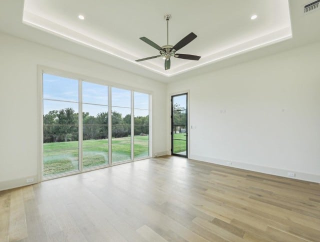 Now comes what you really wanted to see — the unbelievable primary suite. The hardwood flooring continues throughout the home and into the bedroom. The bathroom is a true spa retreat with fancy selections and fixtures, and then there is the primary closet.