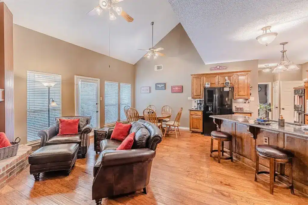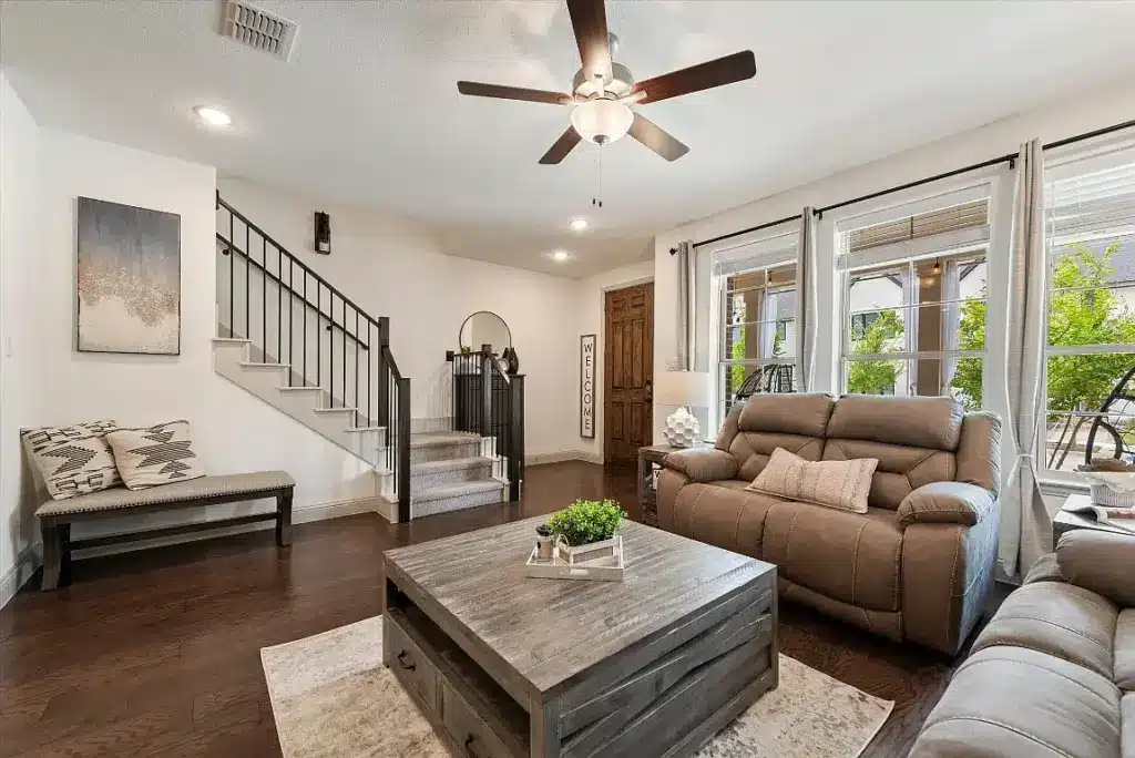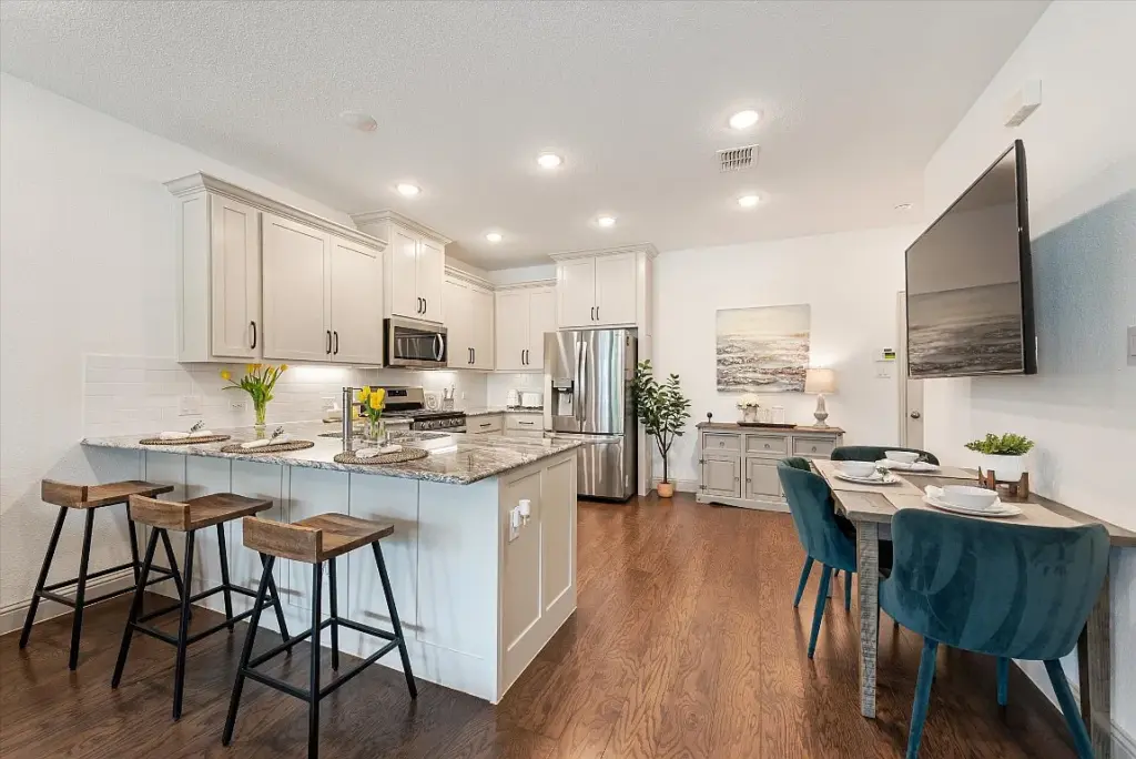 The townhome’s open-concept floor plan connects the family room to the large kitchen. The covered front porch can serve as an additional living area to discuss pre-game strategies.