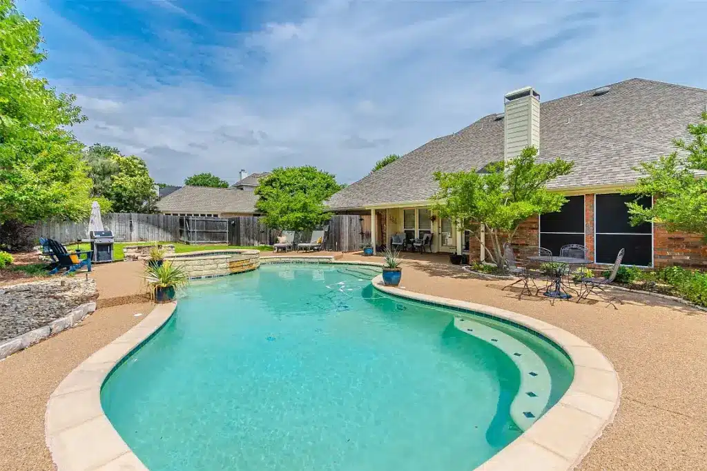 Upstairs are three more bedrooms, two bathrooms and an extra living area where the Rangers’ away games could be watched on a flat screen. The backyard is a grand slam of fun. Entertain a group of fans after a Rangers home game with a swimming pool, hot tub and a fire pit.