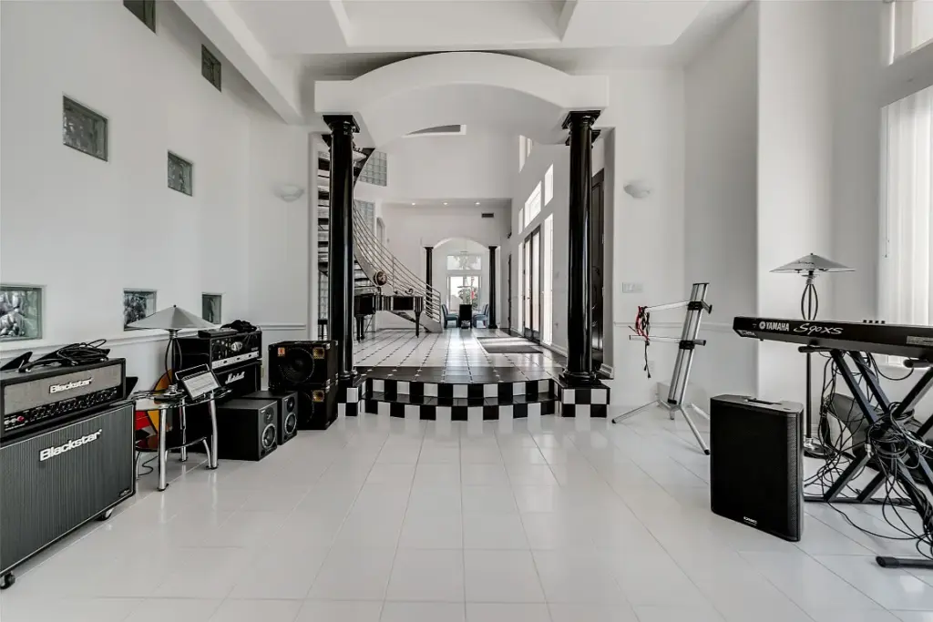 But in case the family is musically inclined because there’s a sound-proofed music studio. Got groupies? Room for them with lots of guest parking behind the gate, and if you’re rolling like a rock star, a 10-car garage awaits.