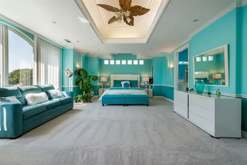The owner’s bedroom has that rockstar quality, too. From walk-in closets to a private living area complete with a wet bar, the bedroom was created for someone who lives large. Built in 1999, the house is priced at $1.5 million.