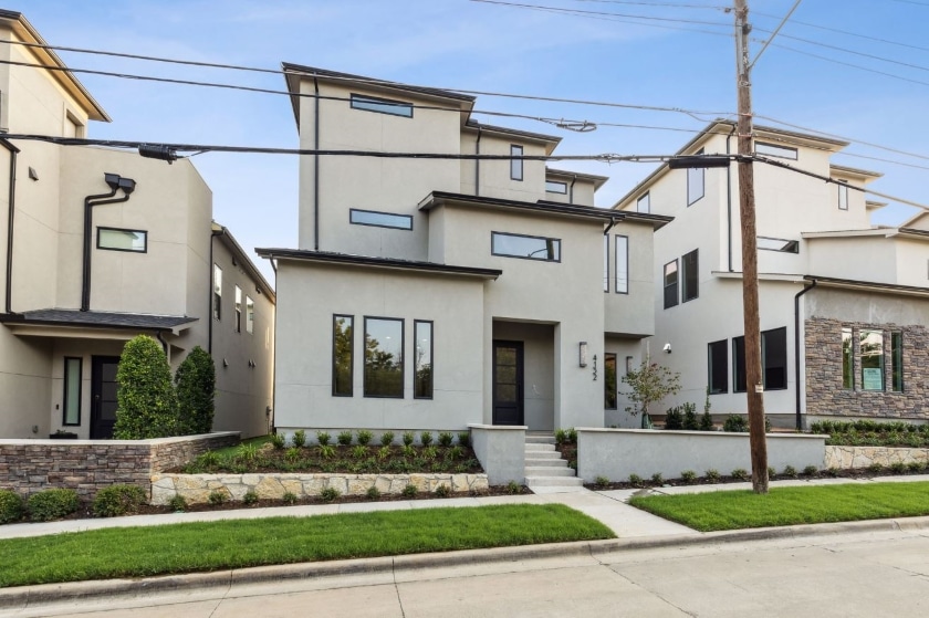 Skyline Terrace is an enclave of 31 single-family homes with surprisingly large lots, six-foot privacy fences, and two-car garages. Differentiating themselves from other in-town new construction homes, these lots are traditional house-sized, not townhome-sized — and the homes are detached from one another. The neighborhood of stone and stucco modern homes is located along Maple Ave., south of the Dallas Hospital District where the Dallas North Tollway and Harry Hines entwine.