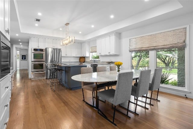 The kitchen is still the gathering place. Yes, you can easily seat the fête set in the expansive dining area or you could easily grab a pizza and a puzzle and put on your fuzzy pajama pants and slippers and enjoy a fun family night.