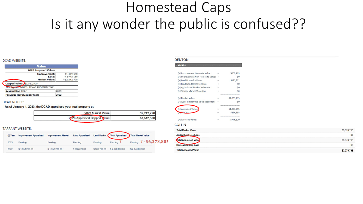 Different counties use different terms for appraised value which can cause confusion among taxpayers when trying to understand how much tax they owe on their homes each year. For instance, some counties call appraised value “assessed” while others call it “capped.” Consistency is needed across all counties so taxpayers can easily understand how much tax they owe each year.
