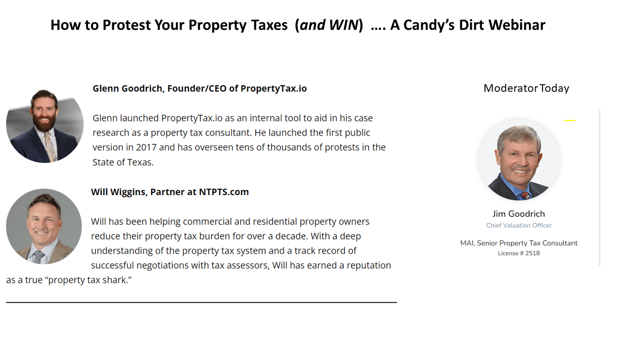More than 250 people attended “How to Protest Your Property Taxes (And Win),” an hour-plus webinar that combined the expertise of property tax appraisal experts Glenn Goodrich and Will Wiggins, frank talk about the politics of property taxes, in-depth charts with the latest data available, and a question-and-answer session with attendees.