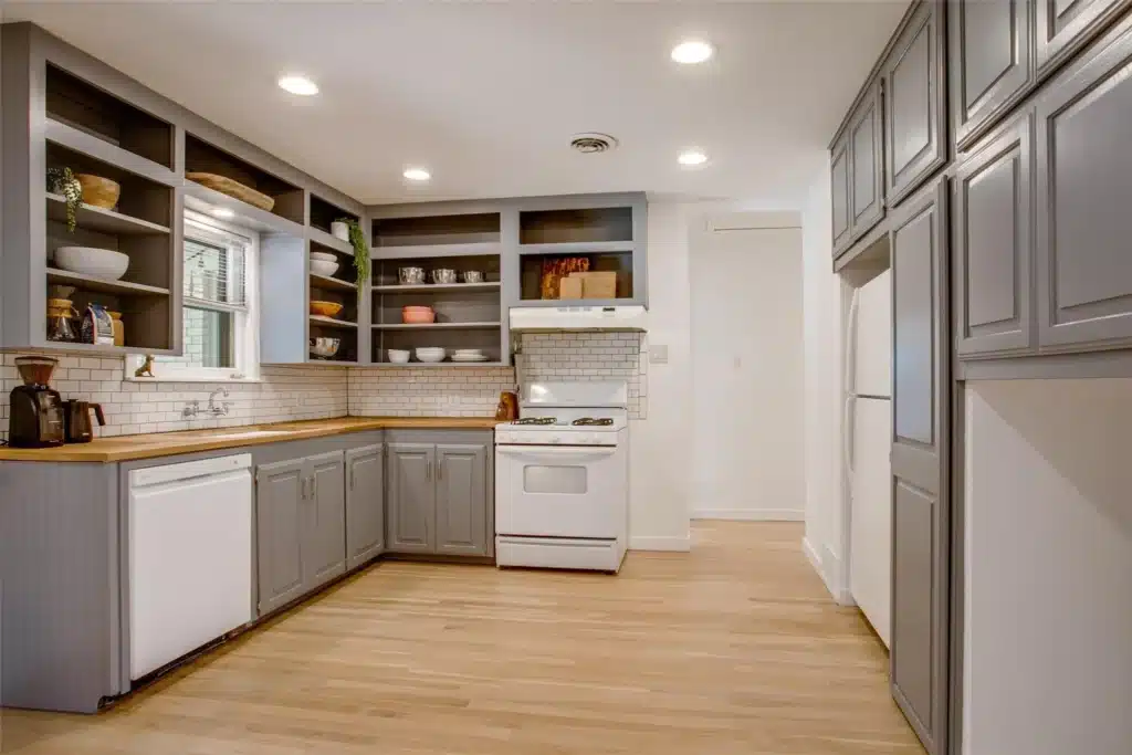 The flow is superb from the living room to the dining room and kitchen, which features butcher block kitchen countertops and a crisp, white subway tile backsplash. Open shelving adds a modern touch to the kitchen, too (but you still have lower cabinets to fit all the junk you don’t want on display).