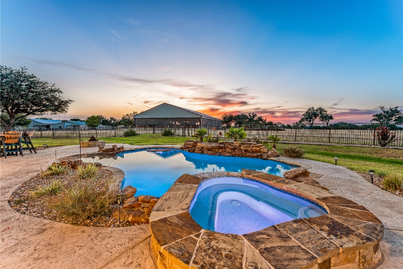 This one is for the elegant equestrian: 4.6 private acres in the sought-after equestrian community of Silverado on the Brazos. The newly constructed home offers 4,860 square feet of luxury ranch living, including an open-concept island kitchen, multiple living areas, stone fireplaces, hardwood floors throughout, a formal dining area, a home office, and a posh main suite. There is a spacious covered patio with an outdoor kitchen and grill, all overlooking the beautiful view and the sparkling pool and spa. A bonus room above the oversized garage includes built-in bunk beds and a full bath. This luxury ranch is completely fenced and cross-fenced with multiple turnout pastures.