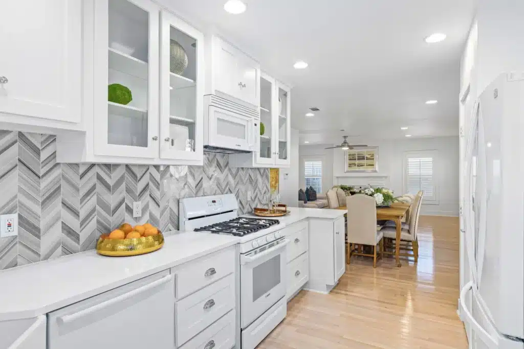 The sizable dining area can accommodate a six- to eight-top dining table and leads directly to the galley kitchen featuring Bosch appliances, custom white cabinets, an apron sink, and quartz countertops. The timeless black-and-white color combination is repeated in the chevron backsplash.
