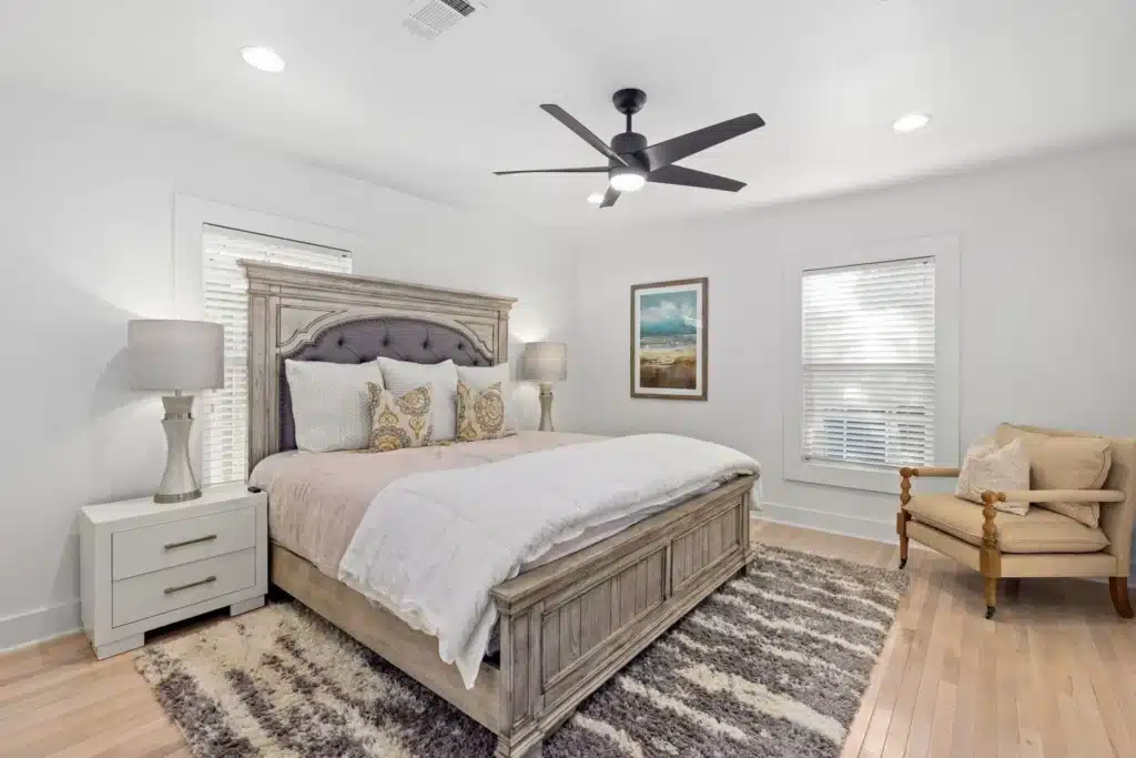 The second bedroom includes two closets and also features hardwood floors and access to the back deck making it the perfect guest bedroom, private office, or fitness room. Just across the hallway, the second full bath has also been remodeled and continues the classic black-and-white theme.