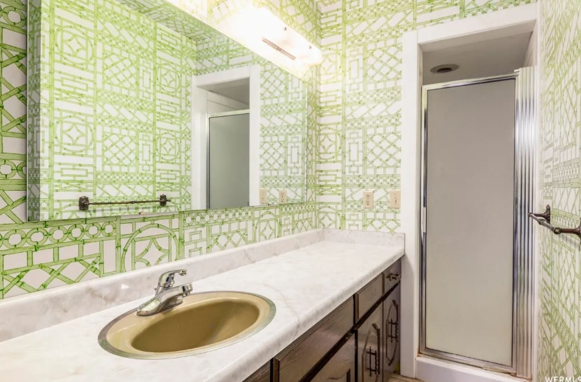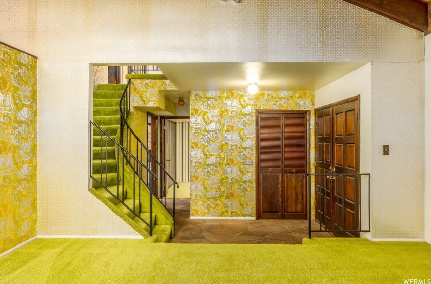 It takes your breath away, right? Is the shag carpeting really baby poop green or does it only look that way because of the lighting? I dare say, the exposed beams, the shag, the shiny wallpaper — all of it — would make Mike and Carol Brady green with envy.