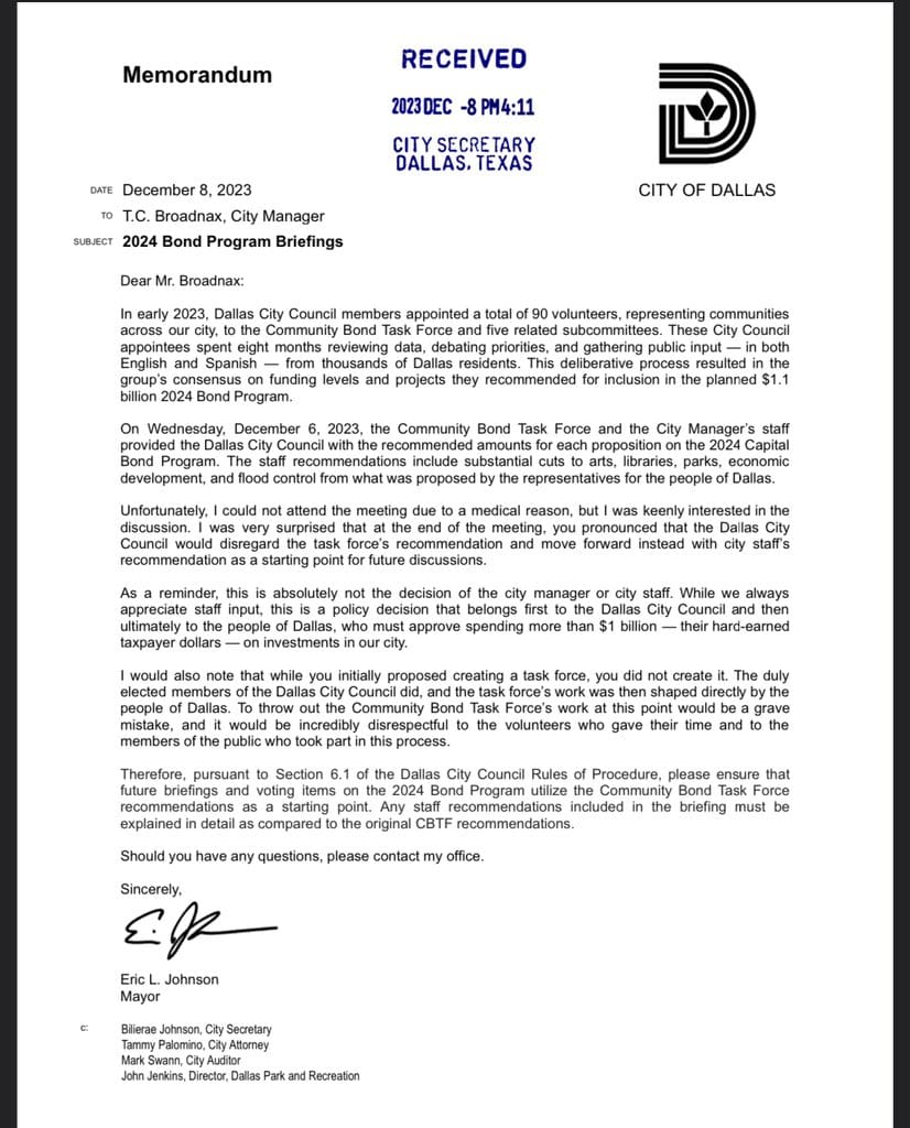 “Therefore … please ensure that future briefings and voting items on the 2024 bond program utilize the Community Bond Task Force recommendations as a starting point,” Johnson wrote. “Any staff recommendations included in the briefing must be explained in detail as compared to the original CBTF recommendations.”