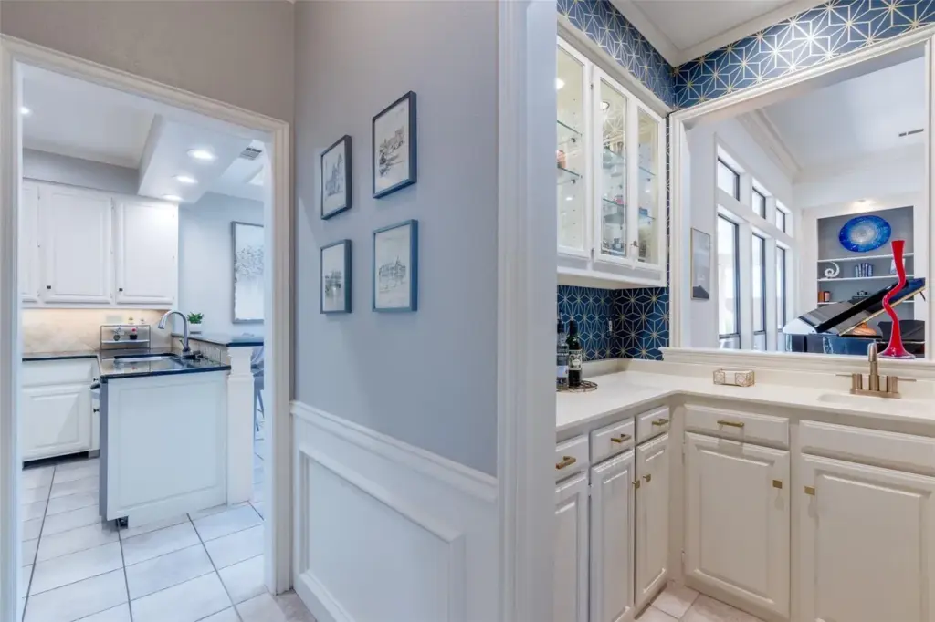 Even the wet bar, a staple of the decade’s homes, has been made current with lighted glass cabinets and celestial-inspired geometric wallpaper.