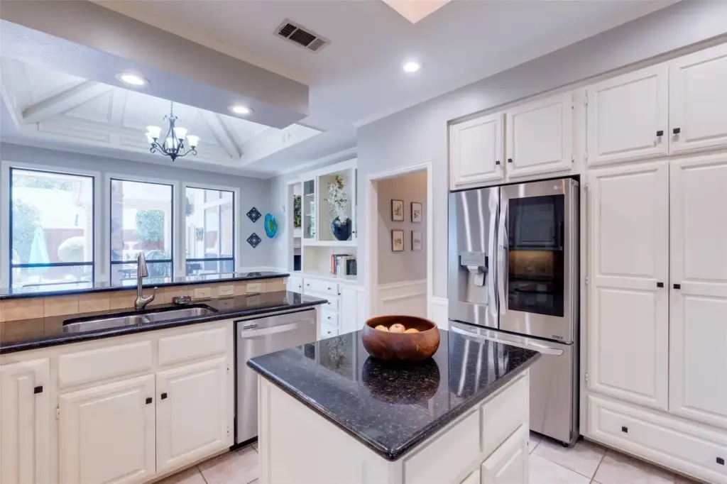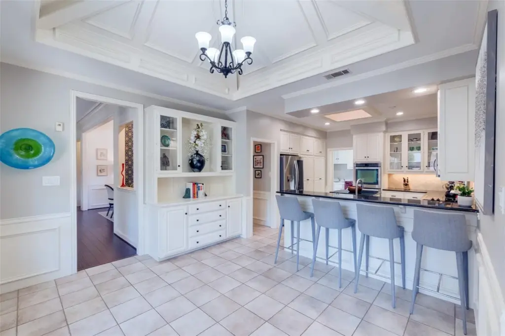 As you step into the kitchen and family room, there are a few architectural reminders that this Plano home was a child of the ‘80s — namely, the coffered ceiling cove above the kitchen’s breakfast nook. You’ll find plenty of those same beamed pentagons or hexagons in similar ‘80s homes around Plano. Here the owners have neutralized the architectural feature to be white, which blends nicely into the ceiling.