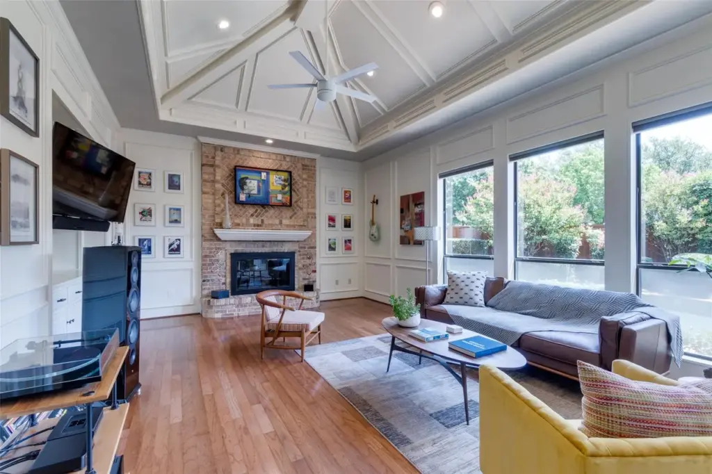 The coffered ceiling continues into the generously-sized family room that’s been fully wired for a sound system and data. That small detail is a great example of subtle home updates you can’t really see. Then the abundance of windows ensures that natural light floods every corner of this family room, creating an inviting and bright ambiance.