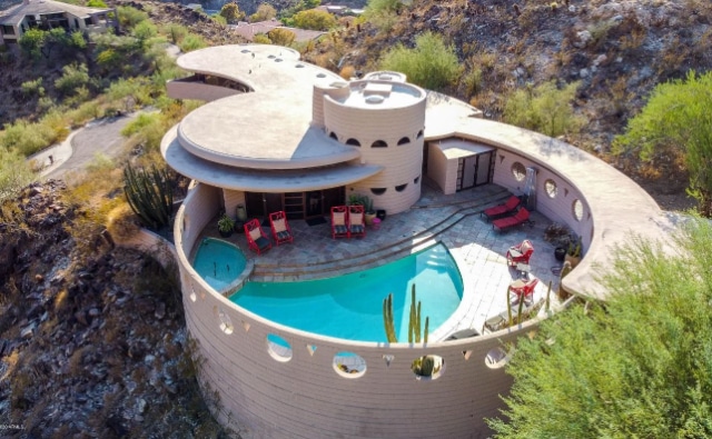 Wright designed the house to blend in with the curves of the surrounding mountains while overlooking Palm Canyon. This is a rare home to be on the market because only 14 homes of the more than 1,000 Wright designed were circular.